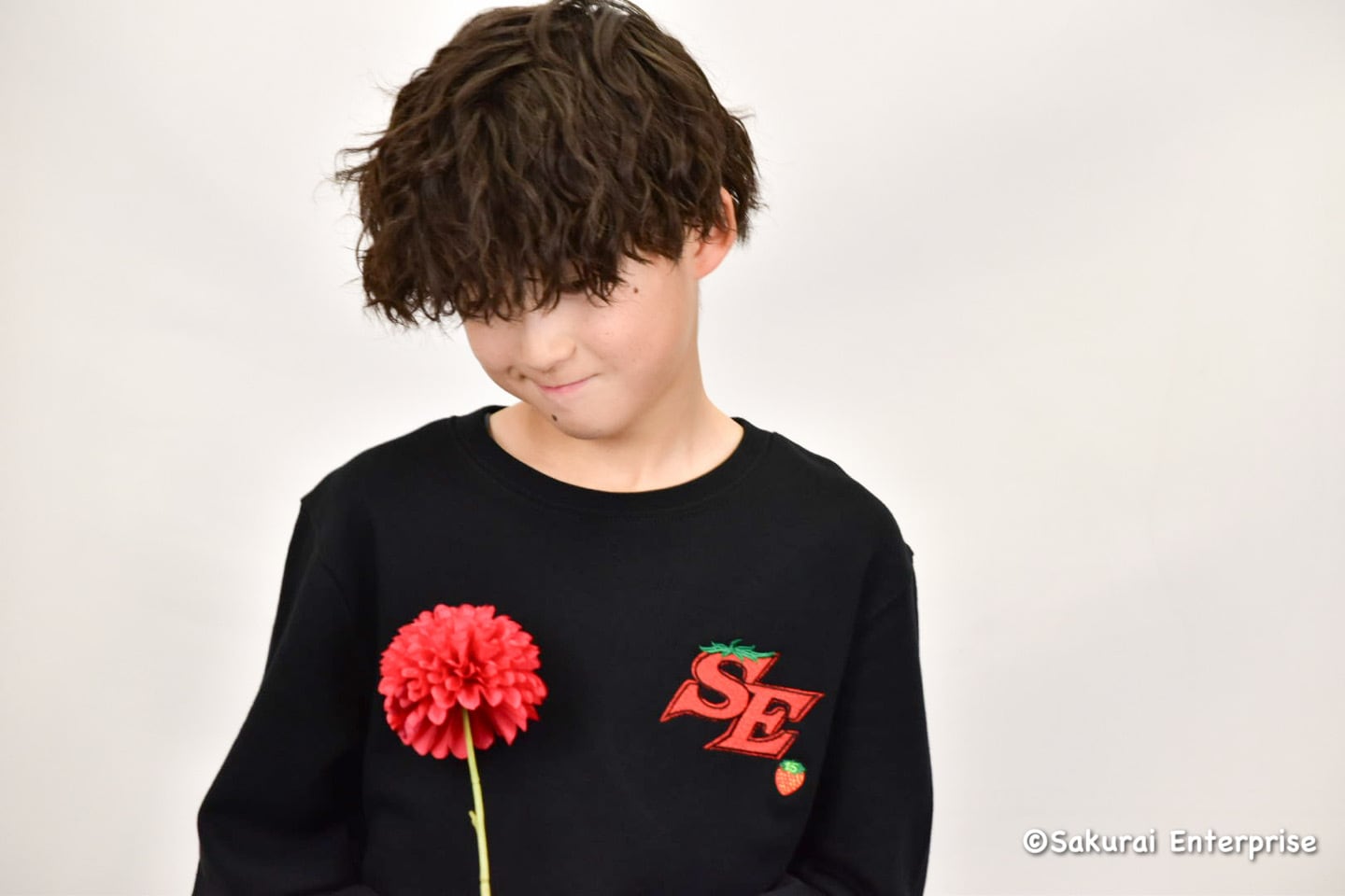 胸元に配されたのは、SAKURAI ENTERPRISE を象徴する「SE」高級刺繍ロゴと、いちごモチーフのコラボレーション。